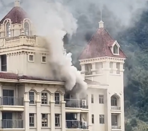 大量浓烟不断从窗户向外涌出